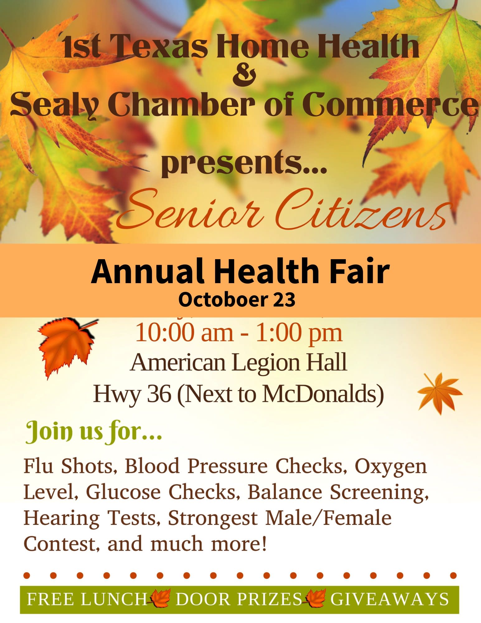 14th Annual Senior Citizens Health Fair at Sealy's American Legion Hall! Hosted by 1st Texas Home Health- Sealy & Weimar and Sealy Area Chamber of Commerce. The event is free and open to all seniors.Images