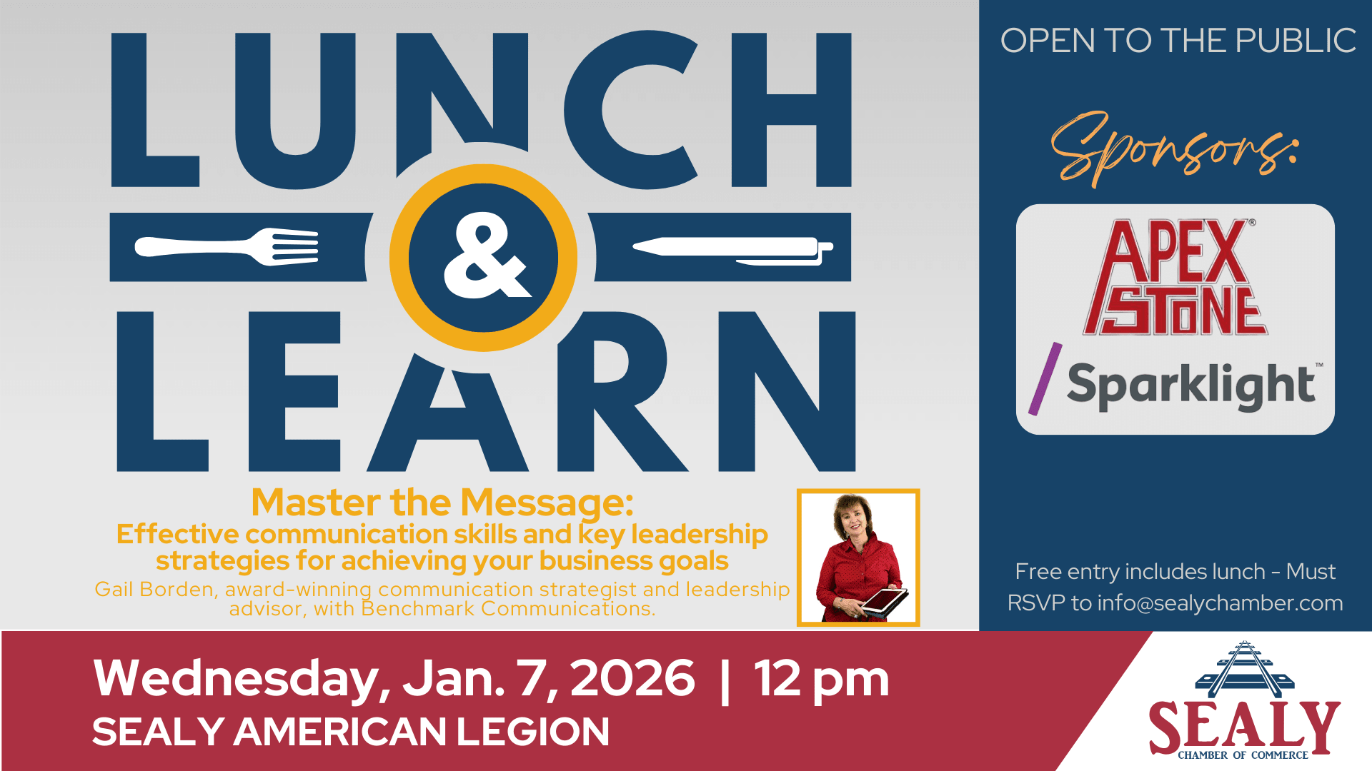 All are welcome to attend. Get all your chamber and community updates and Lunch & Learn with our featured speaker Gail Borden with Benchmark Communications. Bring your business cards and network. If you have an event flyer, please bring it and leave it on the front table for everyone to see.