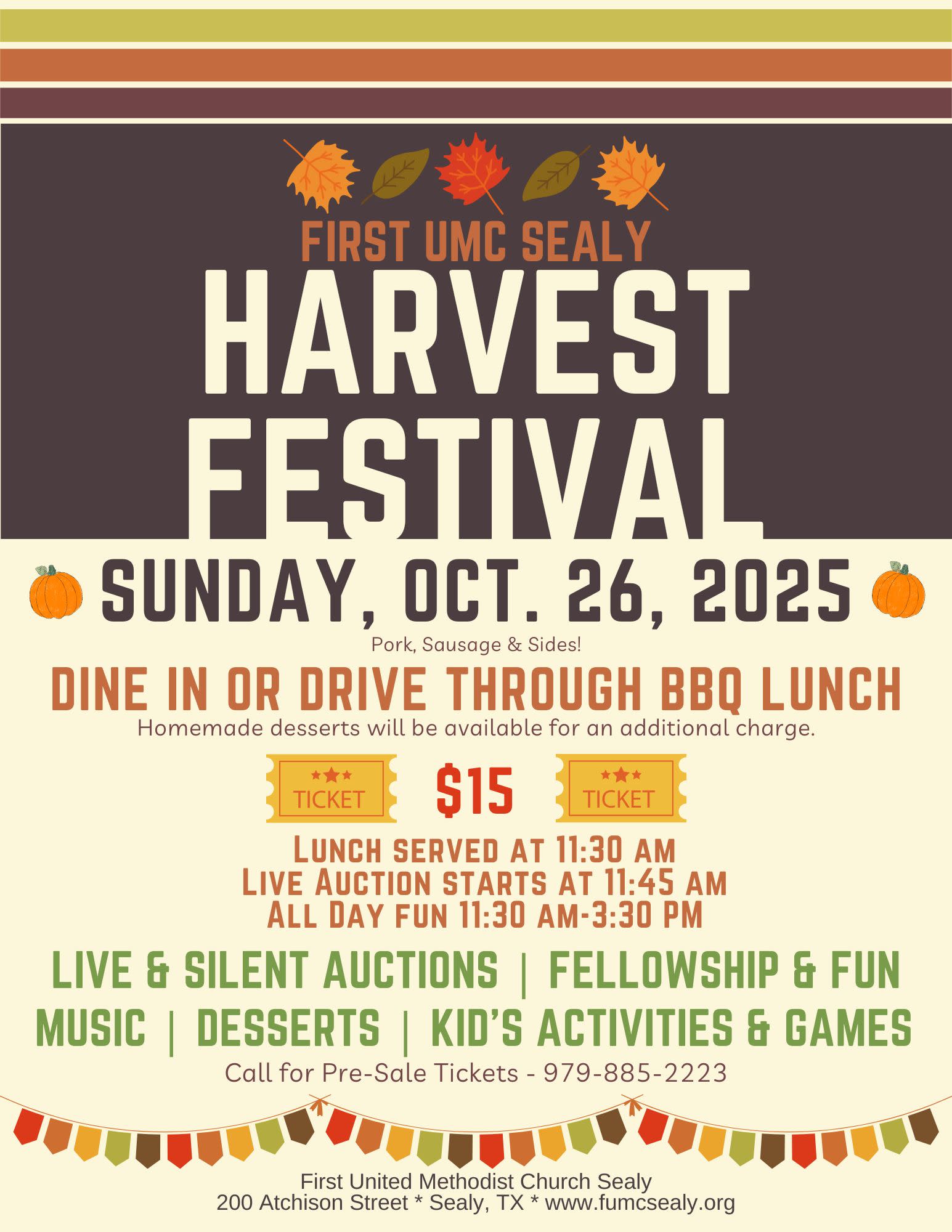 Our annual Harvest Festival will be even bigger this year and will include a bake sale, silent auction, barbecue pork dinner, petting zoo, bounce houses, games and activities for children, corn hole, and more. Activities will begin at 11:30 am and end at 3 pm